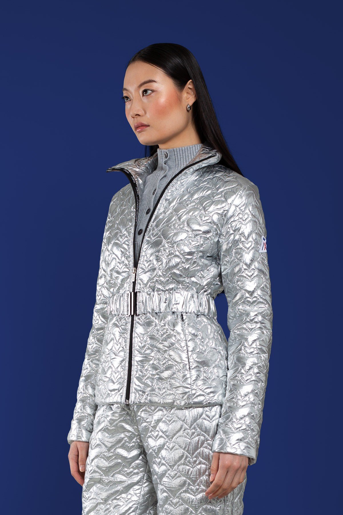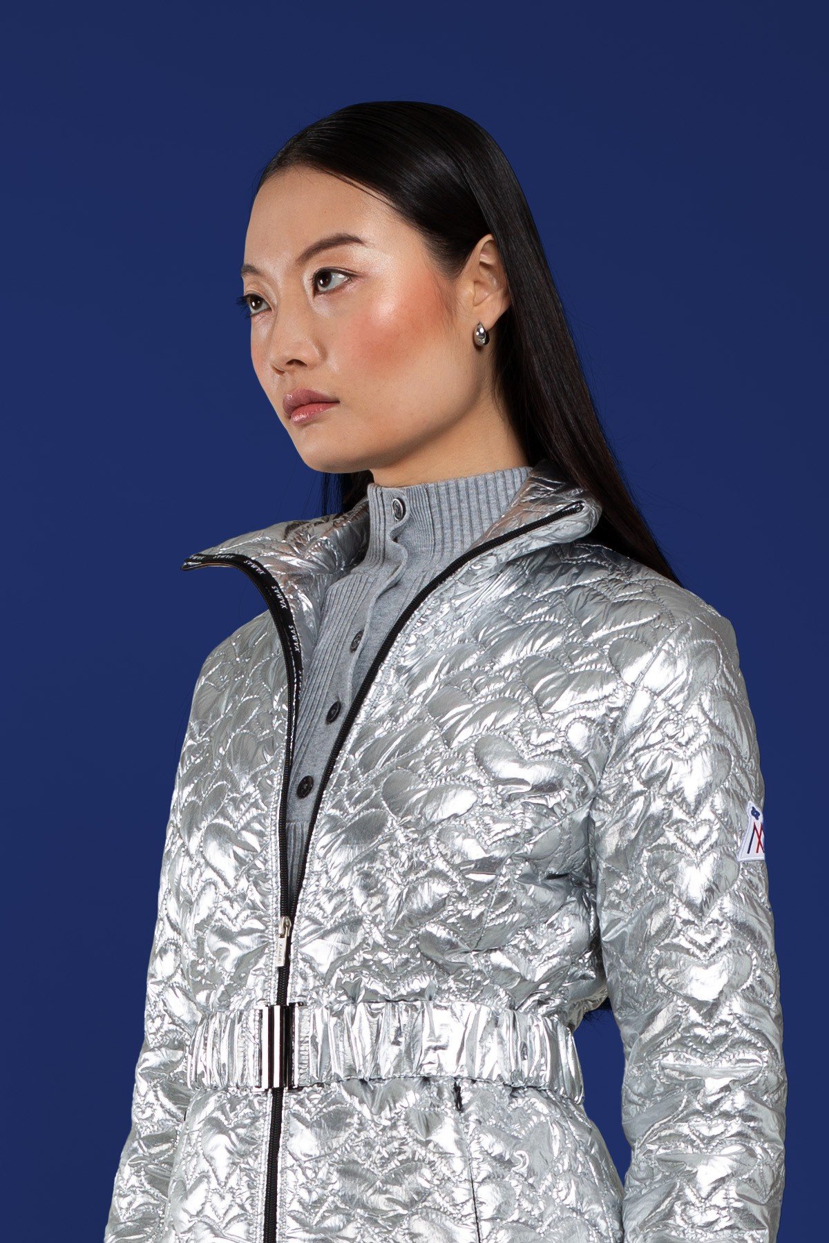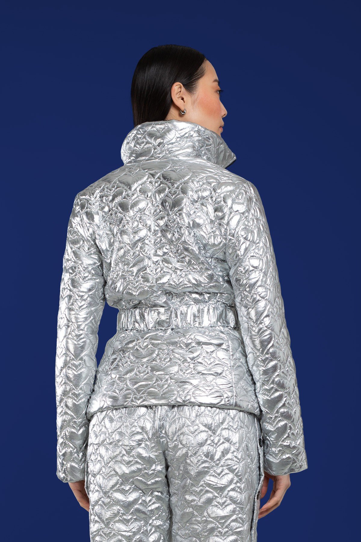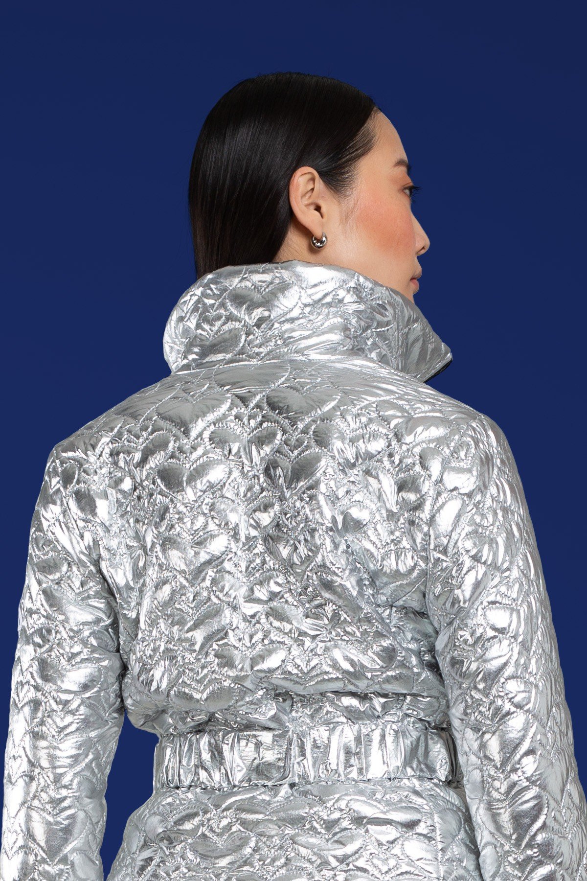 Une veste argentée élégante confectionnée en 100 % nylon avec une isolation en mousse et une doublure polaire confortable, avec un motif subtil en forme de cœur qui ajoute une touche d'élégance à votre garde-robe d'hiver. Doté d'une ceinture assortie amovible.